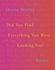 Formally inventive and conversational, the poems, prose poems, lyric essays, and “notebook entries” in Did You Find Everything You Were Looking For? explore our bewildering, increasingly fragmented lives. Unpredictable and unfailingly curious, Donna Masini—in her most compelling, wide-ranging book yet—moves from elegy and intimate address to exuberant performance and meditations on mortality and time.